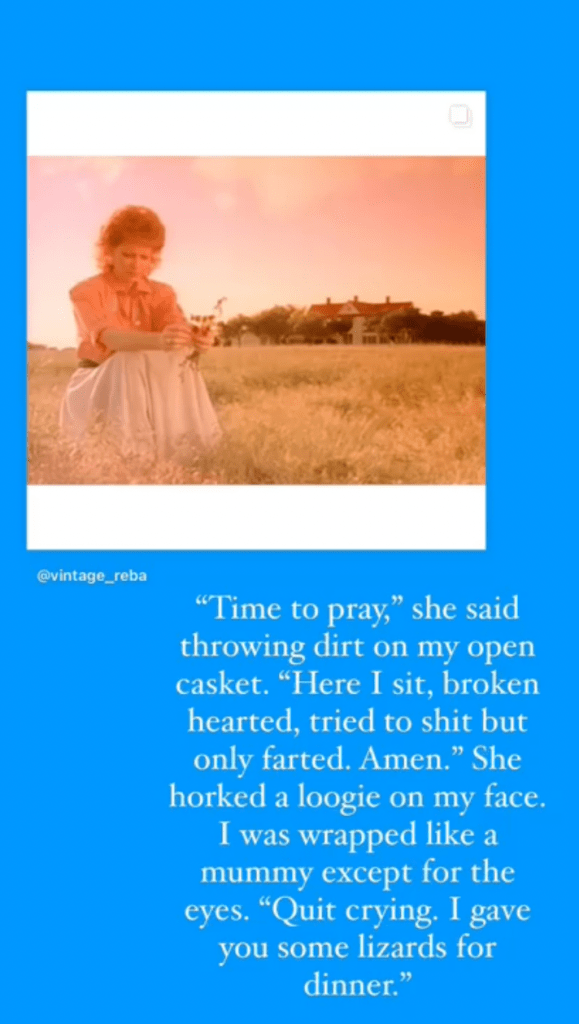 “Time to pray,” she said, throwing dirt on my open casket. “Here I sit, broken hearted, tried to shit, but only farted. Amen.” She worked a loogie on my face. I was wrapped like a mummy except for the eyes. “Quit crying. I gave you some lizards for dinner.”